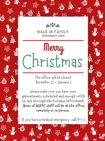 Since our office will be closed for Christmas and New Years, please make sure you have your appointments scheduled and enough refills to last through the holidays beforehand. None of WIFPC staff will be at the office remotely or in person.